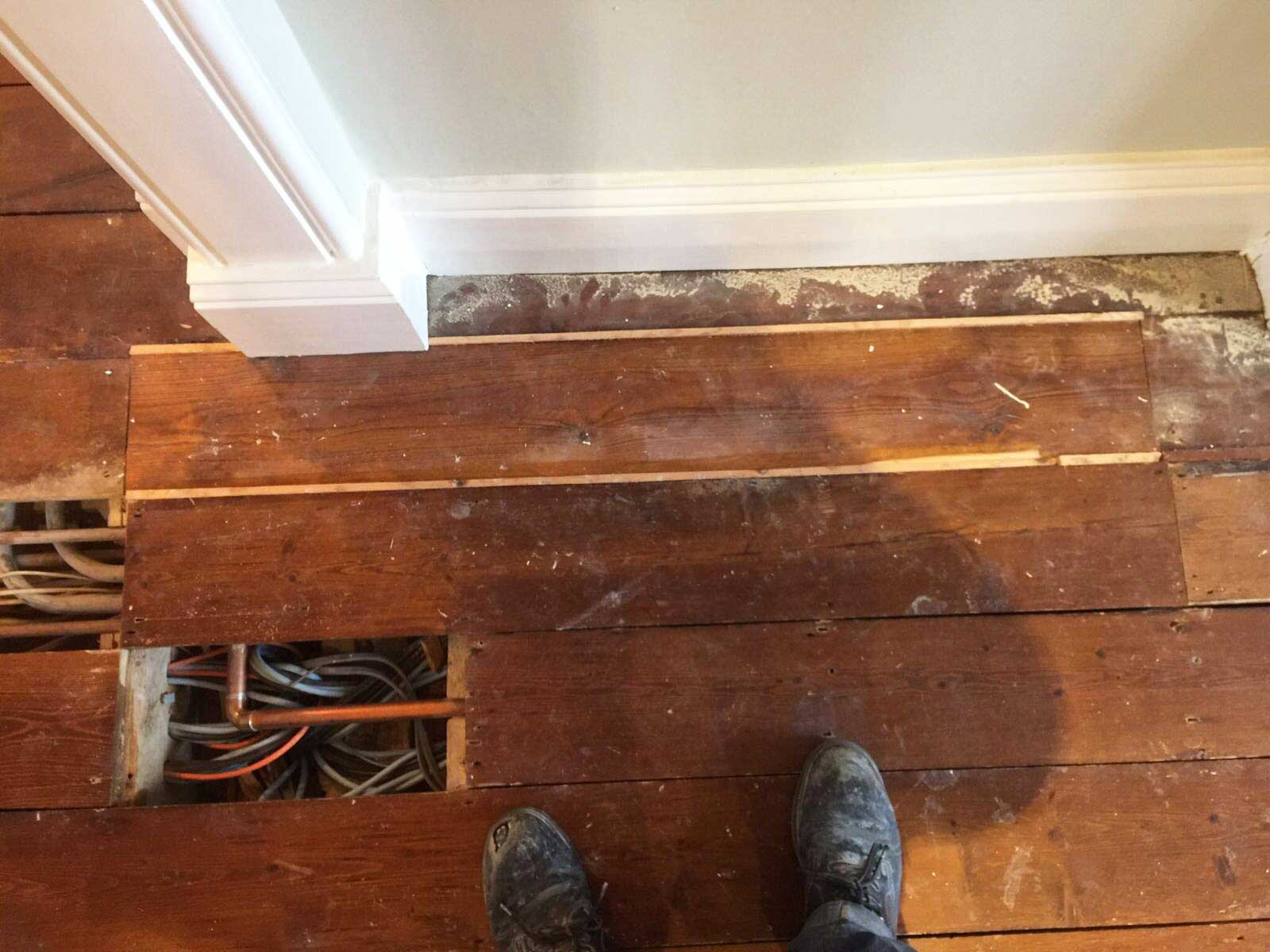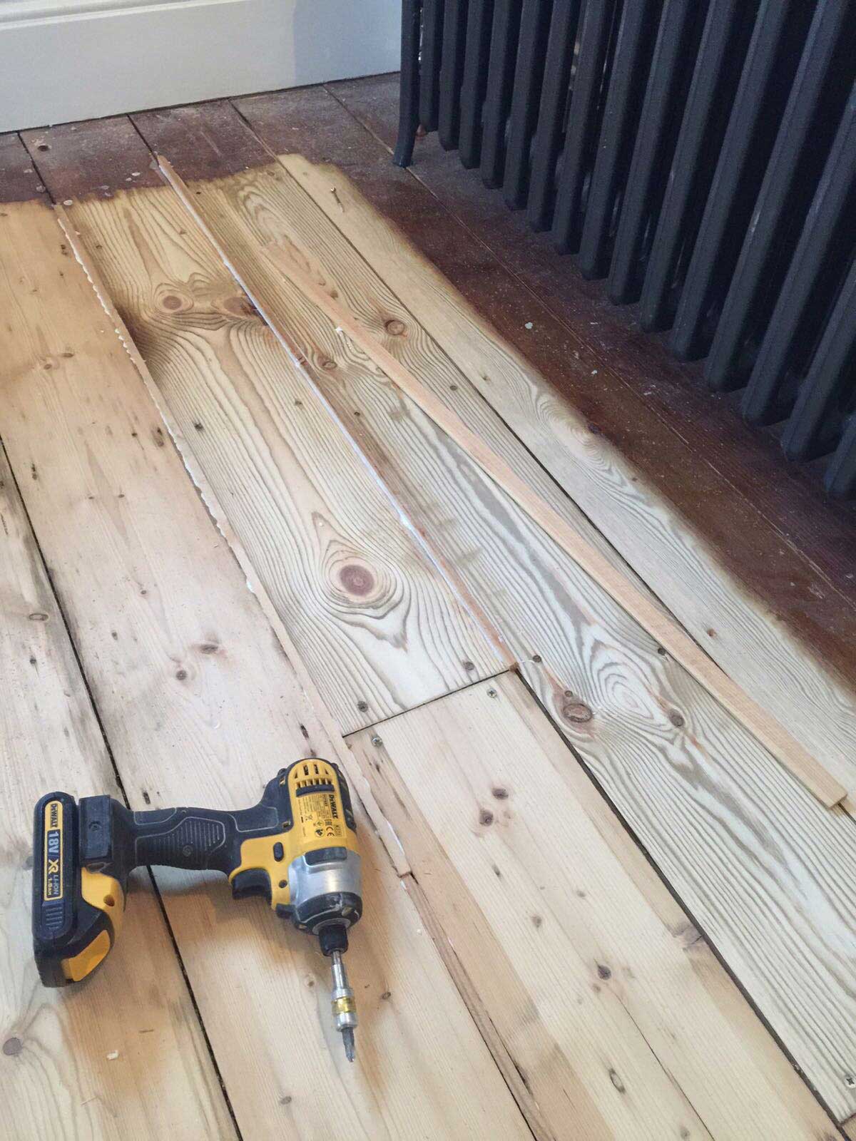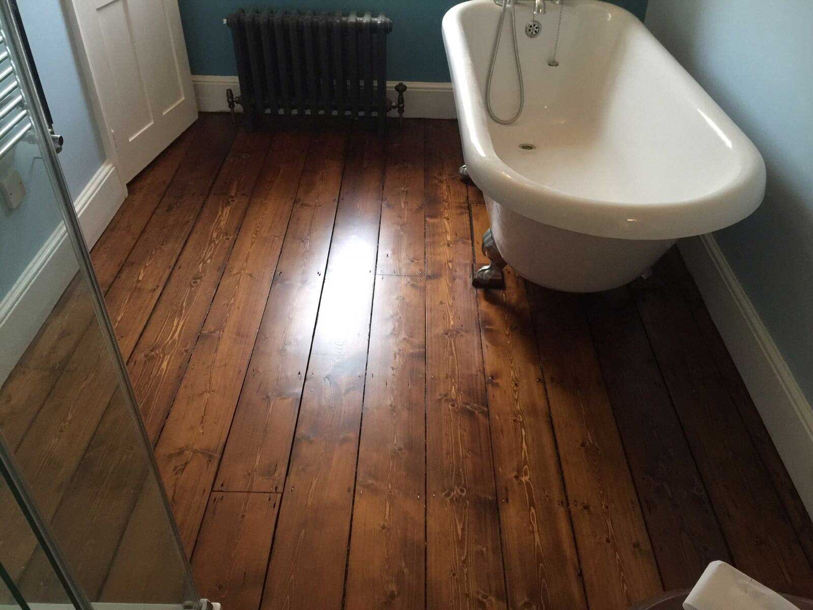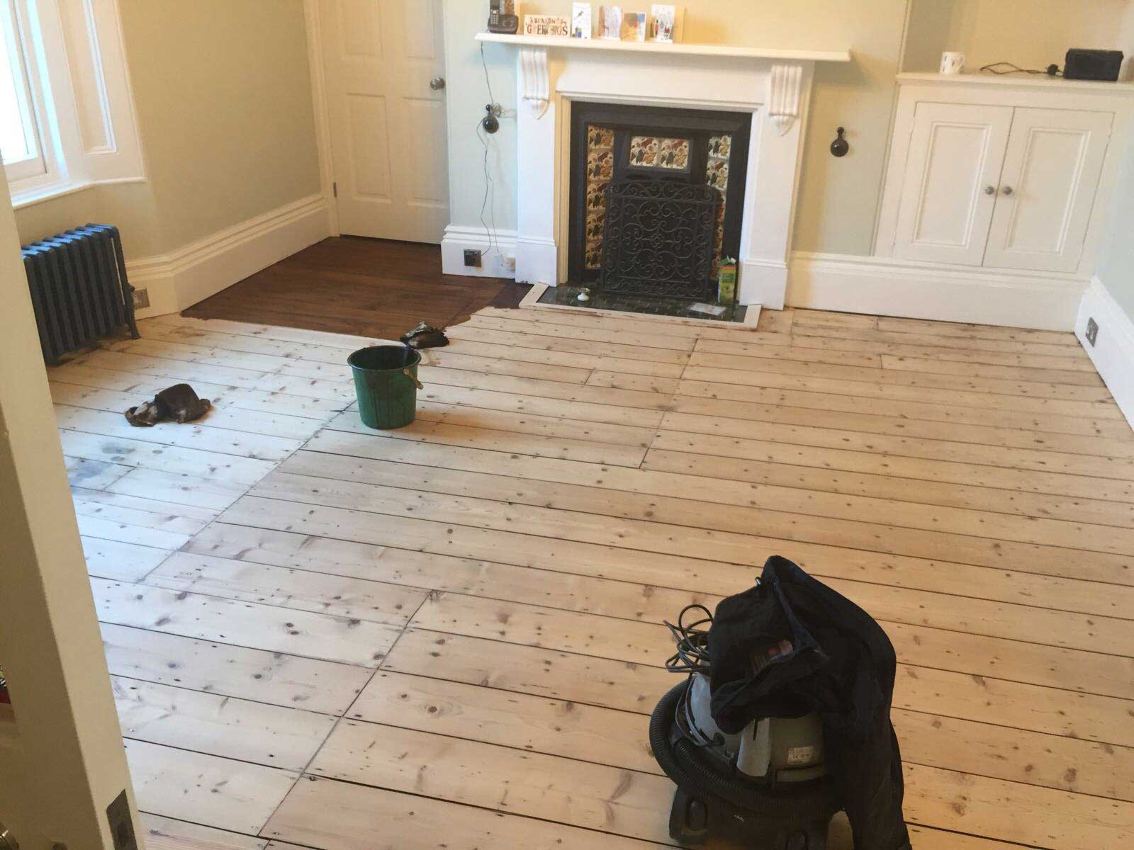 This is the condition of the wooden floor boards before restoration commenced. Some areas looked worn and had scuff marks and there were visible gaps between some of the floor boards.